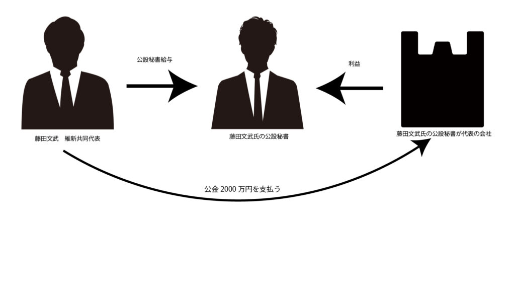 藤田氏の事務所が、公設第1秘書が代表を務める会社に対して、政党助成金や調査研究広報滞在費、選挙関連の公費など、総額でおよそ2千万円を支出していたことが指摘されています。